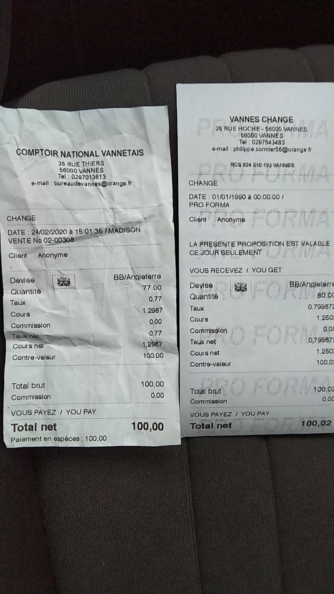 Bonjour Ce matin je me suis rendu pour la première fois dans ce bureau de change, j'ai échangé 100EUR en GBP. J'ai été surpris de ne récupérer que 77GBP au regard du cours... Je suis alors passé voir le concurrent 300m plus haut, chez qui j'en aurai obtenu 80. En bref, allez au 25 rue Hoche vous payerez moins cher vos devises ! (Preuve à l'appui) Bonne journée à toutes et à tous